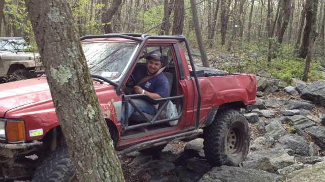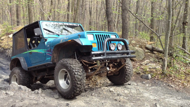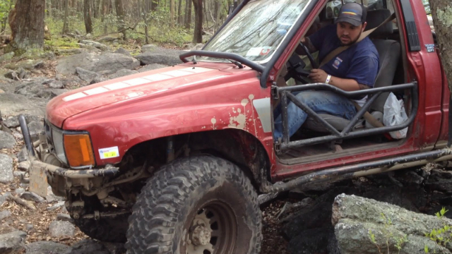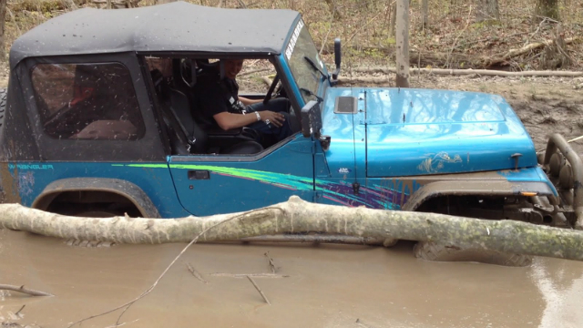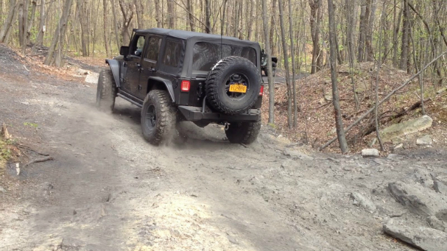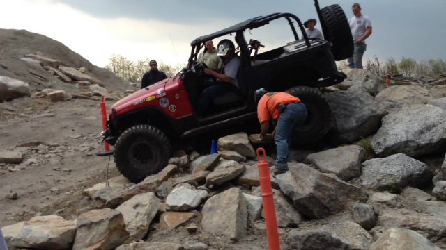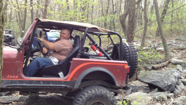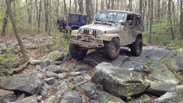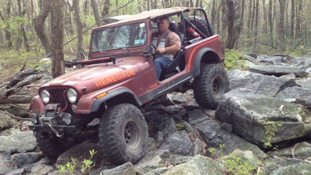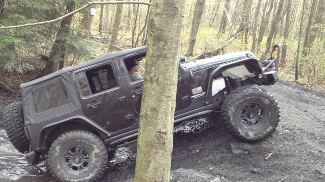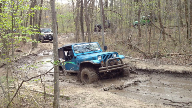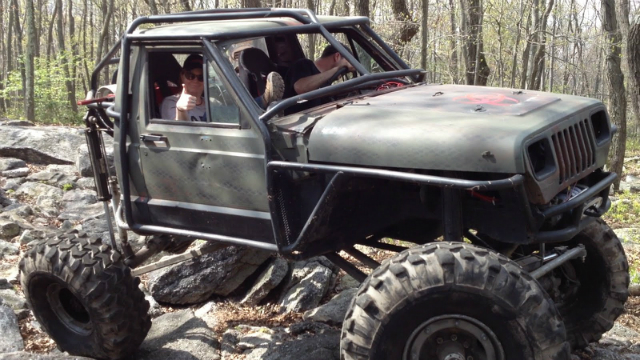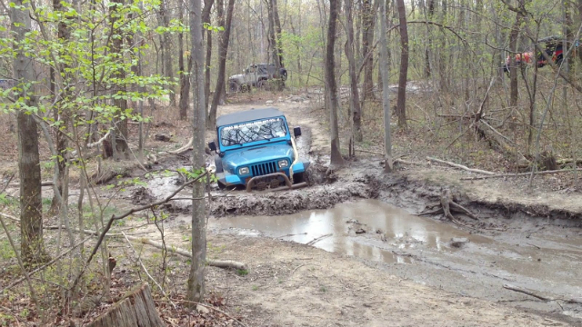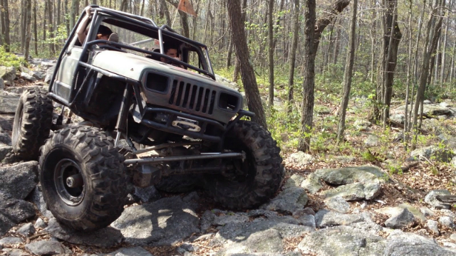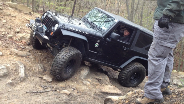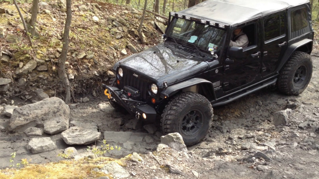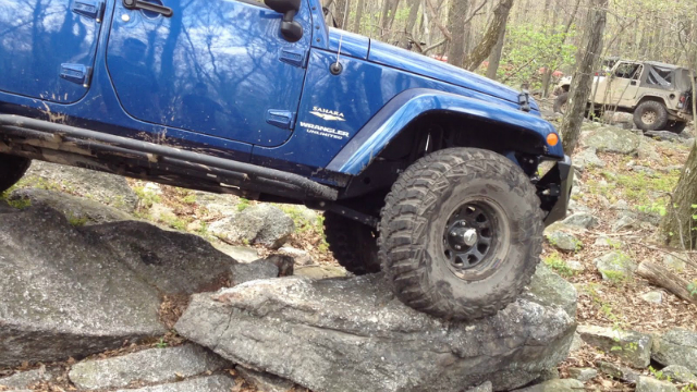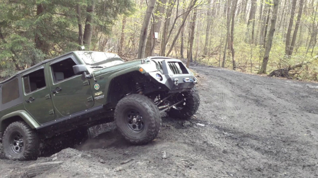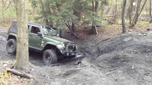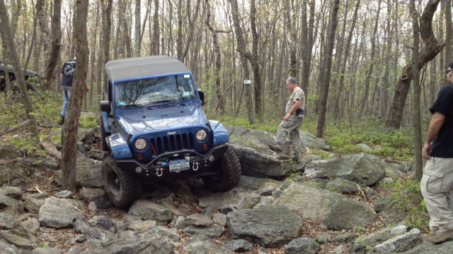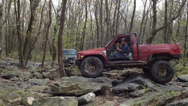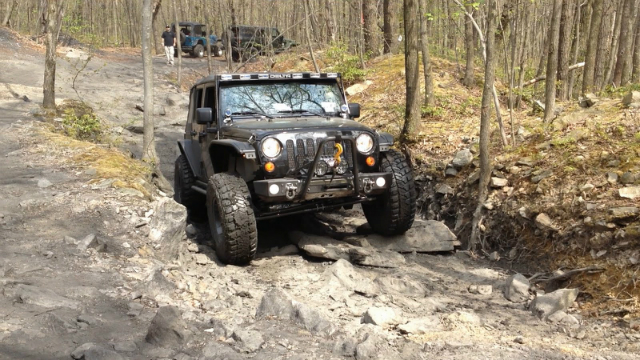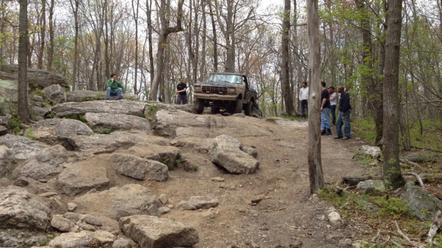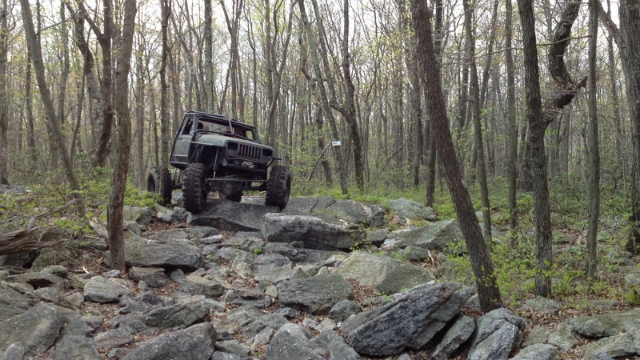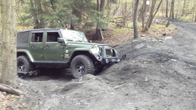 We worked the 1a to 1c system of side trails at first. This consisted of a small but technical hill climb, a little off camber to passenger while turning uphill to driver side (which could be disconcerting since a roll would roll you down into a deep ravine), with a steep climb and an equally steep drop. A little spotting was needed. Eddie Bad Hand tore up a couple of cotter pins holding his disconnects out of the way, the front tires flexed into them. I considered using the onboard welder, scrap metal I carry, and grinder to fabricate new cotter pins by hand, but I was afraid of the coming rain. I've been in weather that was like buckets of ice water getting tossed on you over and over, and I knew that was coming. I would not want to weld in those conditions. Of course that was the Shelikoff Straight off the coast of Alaska in October rolling over 25 footers, but it could happen in central Pennsylvania. It could! It was predicted! So off we went - I was hearing that the trails were a little easy, and people had done 8 and Yellow Jacket the day before, and with the clock ticking to the imminent drenching, we made off to that area post haste.