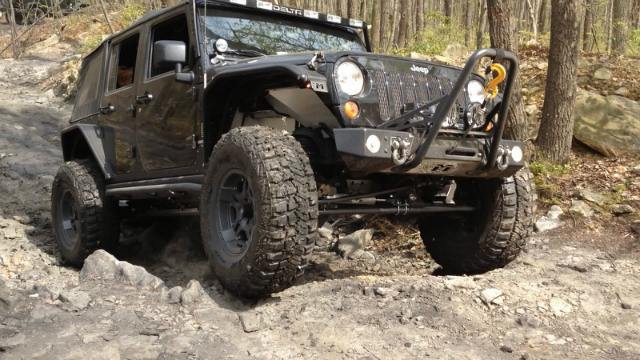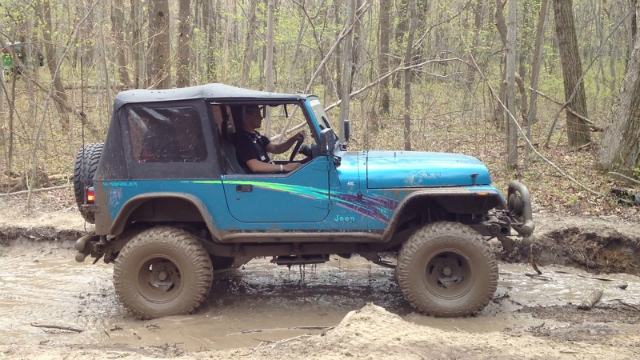 Maqsood felt the rain would hold out until noon or even two - and wheelin is what we labor over our trucks for and set these weekends aside for, so wheelin it is. The group was myself with Rachel as co-pilot, Maqsood, Eddie Bad Hand, and Jim and Bob sharing a jeep - four well set up trucks, but three of them needed to keep driving during the week (I was towing, my rig is basically trail only at this point). We agreed that given the impending fusillade of rain, we'd wrap it up by noon, earlier if the rain hit, and would not take any crazy chances. We hit the trails with me in the lead and Jim and Bob tailgunning, we headed down the green B trail, the idea being to take that easy access road around the park, hitting the shorter, mode difficult trails that branch off and loop back onto it so if anyone broke we'd be better positioned to get them back to the access road and a tow out. I prepared for the coming storm by tossing a raingear in the back of the jeep and finding my windshield wipers. I put them on and everything. Made sure they worked, since this was going to be some serious rain. It almost made me wish for doors. That work.