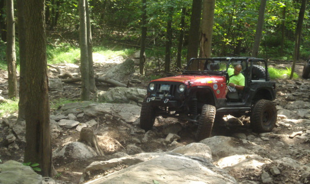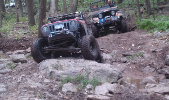 So lets begin the trail of carnage on Friday morning. As I arrived at Rausch I heard the enticing sound of tires deflating in preparation for a lovely day out in the woods. After paying Rausch because apparently everyone wants a piece of the action, Bad Hand and daughter Madison, Maqsood and family, Bob, Amasa and myself all headed out for the Blue Trails. (Editor's Note: The trails are marked black & blue/black.) Prior to leaving for the trail, it was clear the trail guide was nervous of my gear ratio and opened front and rear but I was ready for the challenge. After driving on the green trails for miles, we finally arrived at the playground....snakebite (hmmmm I wonder how it got that name). The morning went accident free until right before lunch when I heard static on the CB. Thinking the other YJ in the group had a problem, I proceeded to the back of the line to find out it was not who I had originally believed to have broken down. It was Bad Hand. Taking the set back well we ate lunch and took the axle shafts out so we could get him off the trail. With the massive 37" tires and detroit lockers those puney universal joints in the front axle were destined to fail. Bob and Maqsood decided to follow Eddie out of the trail after lunch. Maqsood left due to the good old ball and chain and Bob because of no propane. Amasa and I continued with the rest of the group and had an absolute blast with great hill climbs and lots of rocks to crawl over.